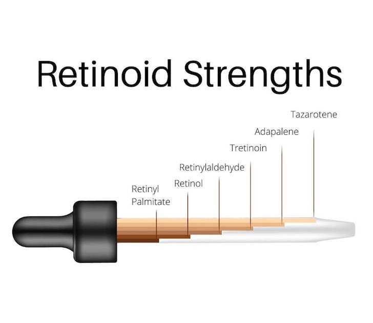 There are all different strengths and types of retinoids – prescription formulas usually contain retinoic acid, and nonprescription alternatives (such as retinol) need to be converted into retinoic acid by the skin at the cellular level. Retinol is more gentle than retinoic acid and retinaldehyde falls in between the two, but it’s important to note that the end results are usually the same…it just takes retinol and others longer to achieve the same results as retinoic acid. There are also weaker retinoids such as retinyl palmitate, retinyl acetate, and retinyl linoleate, which are the most gentle.